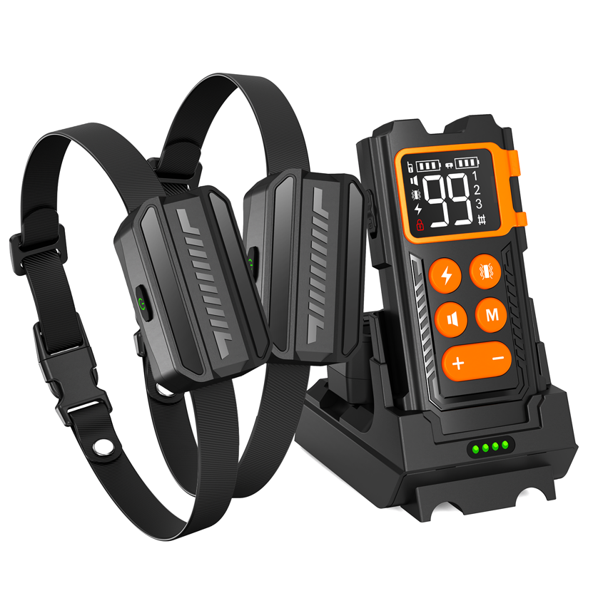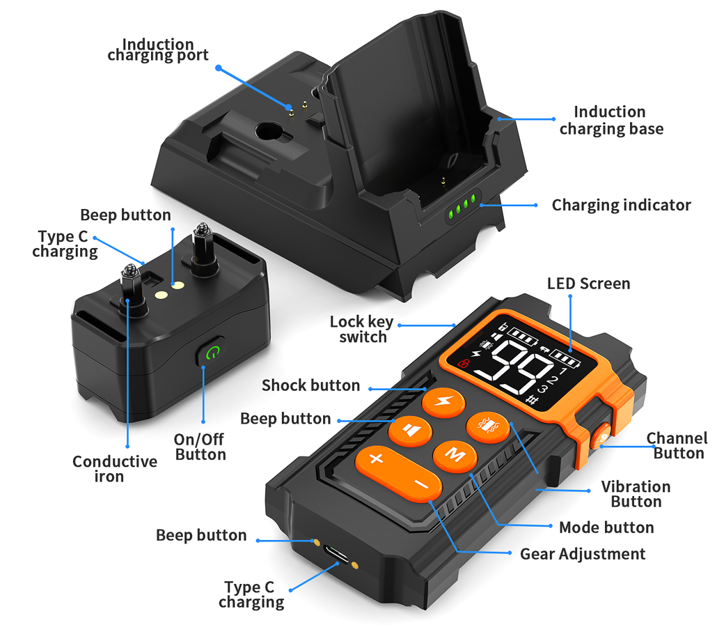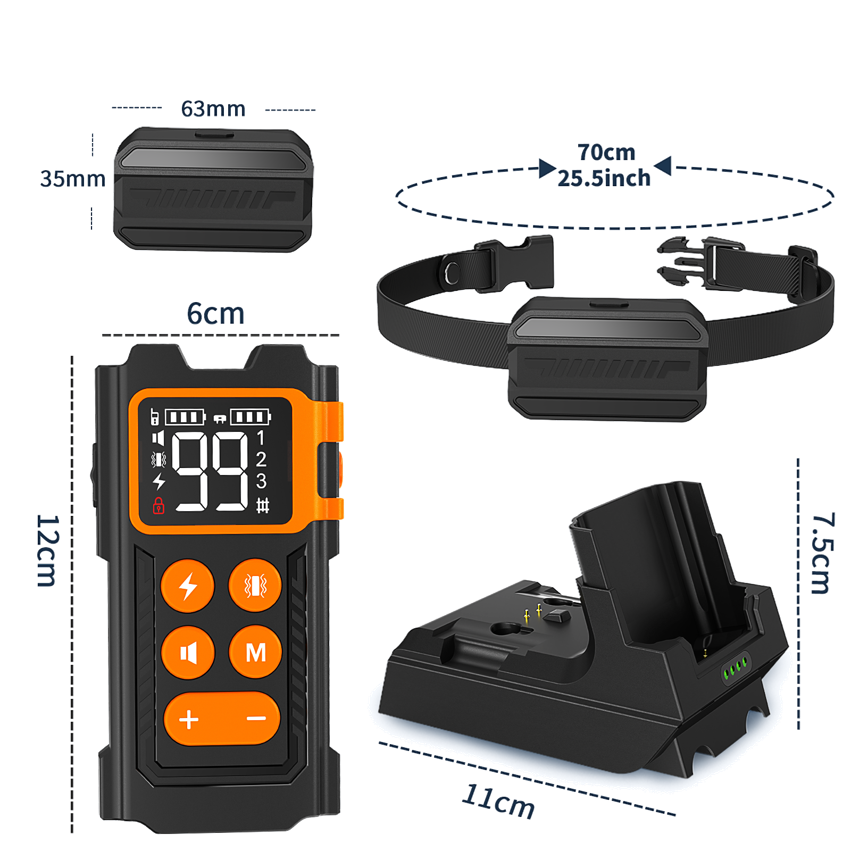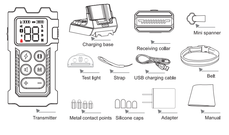 Charge the device before using. It takes 2.5 hours to fully charge the transmitter and the receiving collar.