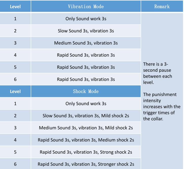 **During the first cycle of 6 warning levels, if your pet returns to the set range at any point, the collar will automatically reset to Level 1 for the next going beyond the boundary, regardless of the previous level reached.